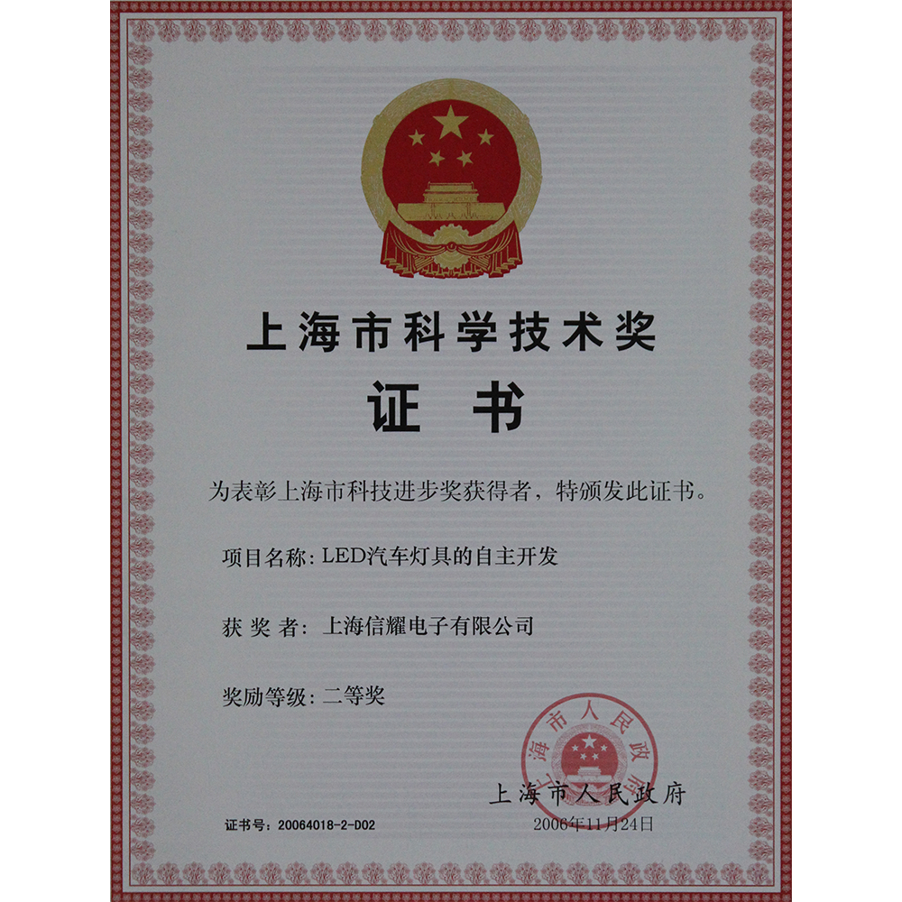 2004年起(qǐ),公司連續被認定爲“上海市高新技術企業”,2010年被認定爲“嘉定區企業技術中心”,2011年被授予“2010年嘉定區小巨人企業”,2019年被評定爲“上海市市級企業技術中心”,連續多年獲評嘉定區先進(jìn)制造業綜合實力金獎企業,2020年榮獲“上海市和諧勞動關系達标企業”稱号。公司參加完成(chéng)多項國(guó)家及上海市科技項目,其中“LED汽車燈具的自主研發(fā)”項目獲得市科技進(jìn)步二等獎,“汽車電子信号燈的自主開(kāi)發(fā)”獲得“汽車工業科技進(jìn)步獎勵基金委員會”三等獎。